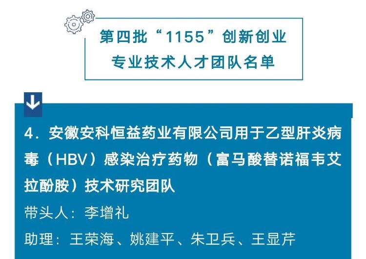 為深入推進實施新時代銅都英才計劃,經(jīng)單位推薦、部門審核、專家評審,市人才工作領導小組會議審定等程序,我公司的一項用于乙型肝炎病毒(HBV)感染治療藥物(富馬酸替諾福韋艾拉酚胺)技術研究團隊入選銅陵市第四批“1155”創(chuàng)新創(chuàng)業(yè)專業(yè)技術人才團隊。此次入選團隊共10個,也是安科恒益藥業(yè)公司第二次入選。