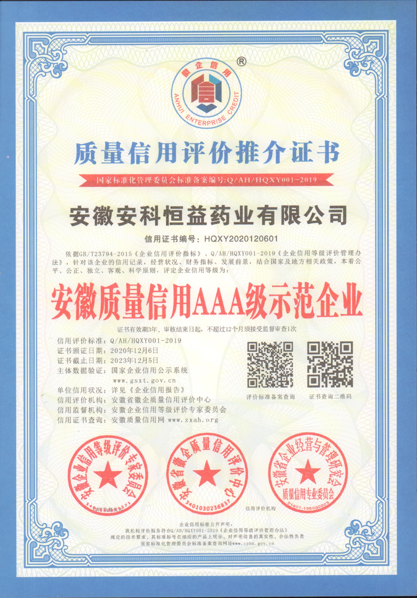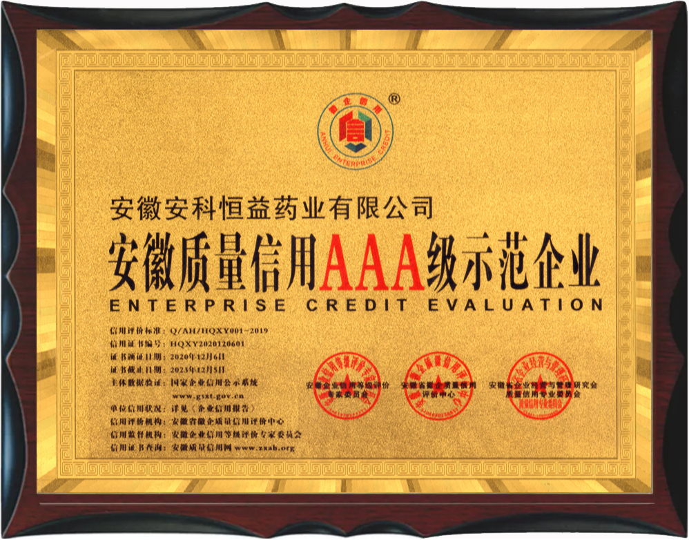 安徽省徽企質量信用評價中心和安徽企業信用等級評價專家委員會依據GB/T23794-2015《企業信用評價指標》、Q/AH/HQXY001-2019《企業信用等級評價管理辦法》,針對我公司的信用記錄、經營狀況、財務指標、發展前景,結合國家及地方相關政策,本著公平、公正、獨立、客觀、科學原則,評定公司企業信用等級為:安徽質量信用AAA級示范企業。并頒發了獎牌及證書。