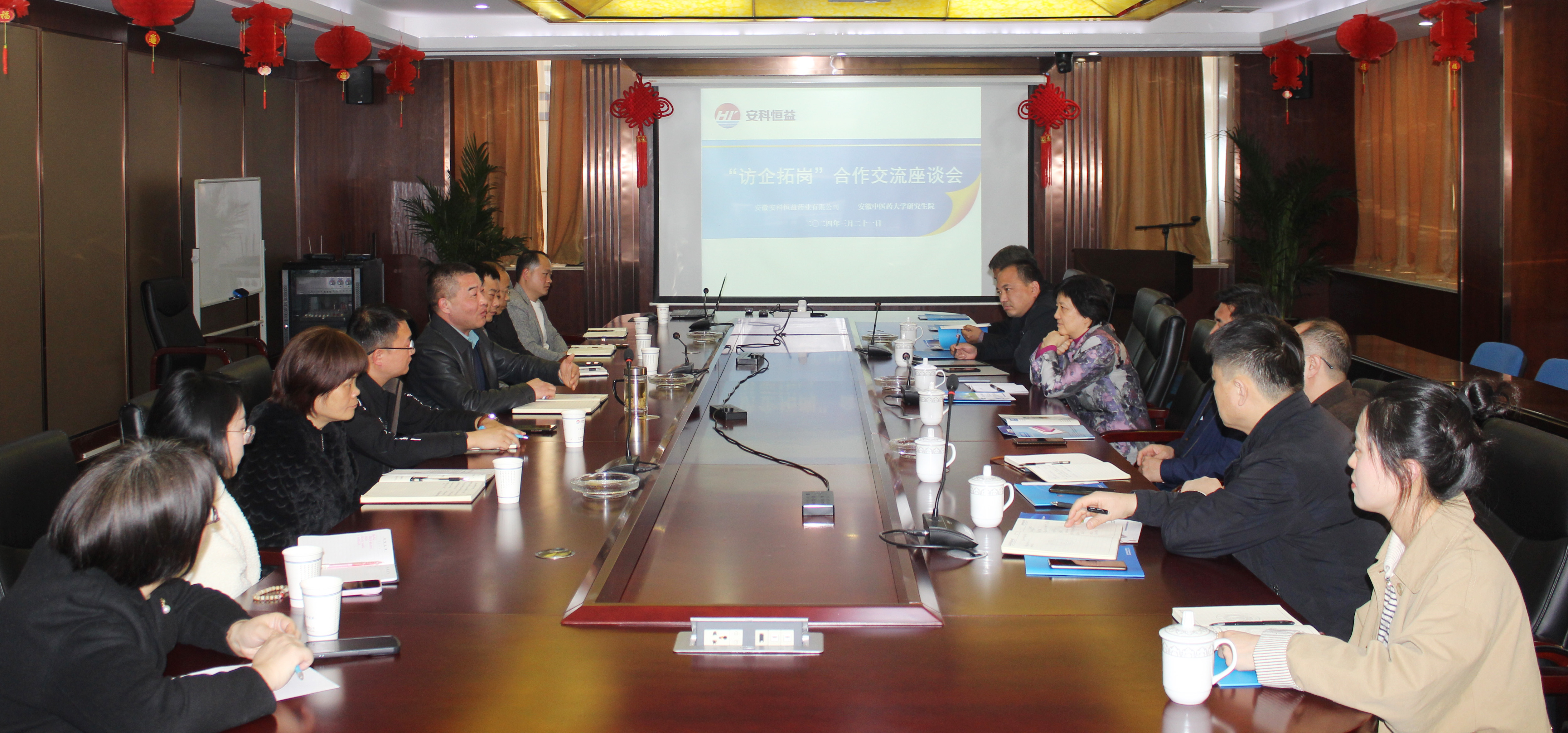 2024年321日下午安徽中醫藥大學副校長戴敏、研究生院院長王鵬、藥學院副書記徐先韜等一行十人來公司開展座談交流活動。